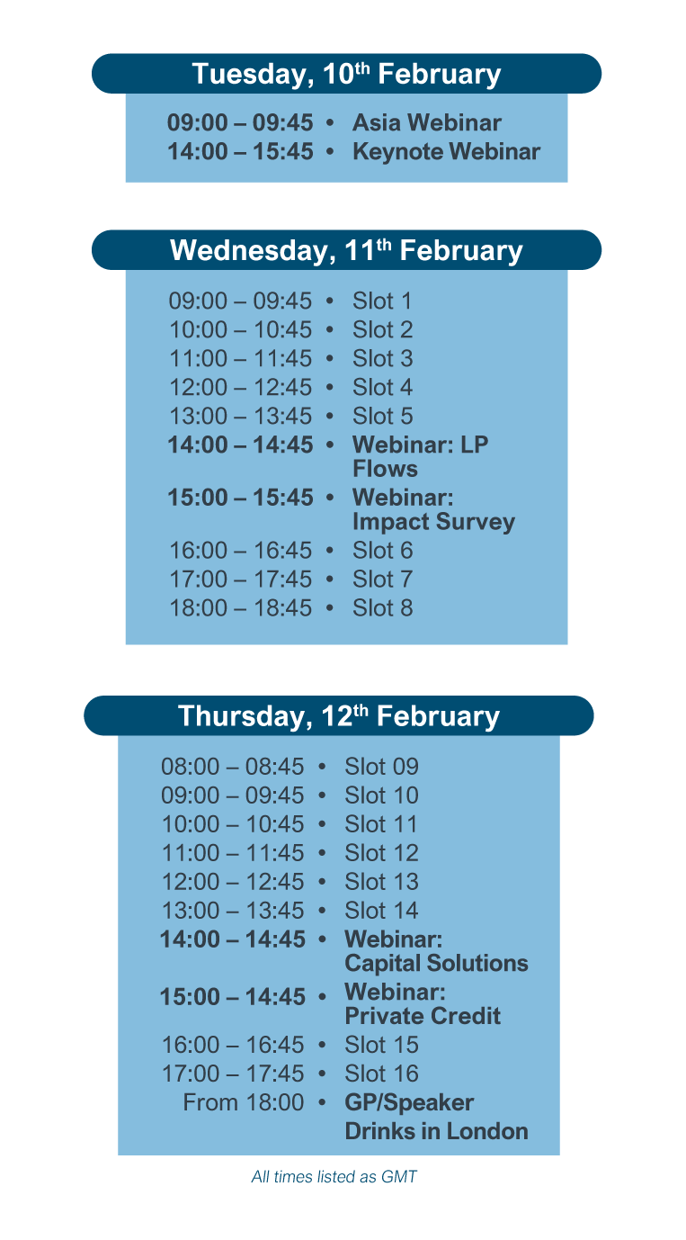 Each Roundtable session will start with a 30 minute presentation by the GP, leaving 15 minutes for questions. The timetable includes meeting slots to suit LPs in a variety of time zones.